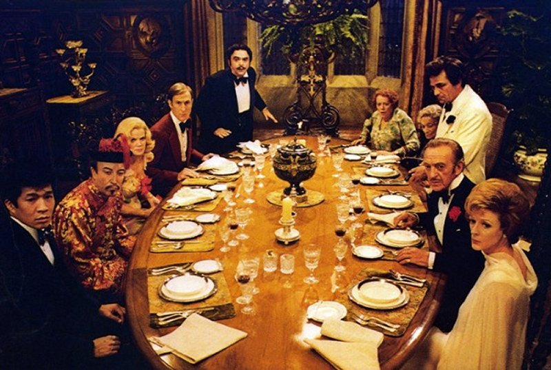 Escena eliminada: En una versión de la película emitida en televisión, no en la que se estrenó en cine o se puede conseguir en DVD, existe una última escena después de que los invitados se hayan marchado. En ella aparece el detective Sherlock Holmes (interpretado por Keith McConnell) y el Doctor Watson (Richard Peel) quienes aparecen en ese momento porque se habían perdido y no conseguían llegar a la mansión. En un primer momento de la escritura del guion de Neil Simon se especuló con la posibilidad de que Holmes y Watson resolvieran el enigma. La cuestión acabó dirimiéndose en un breve cameo que, finalmente, fue eliminada.